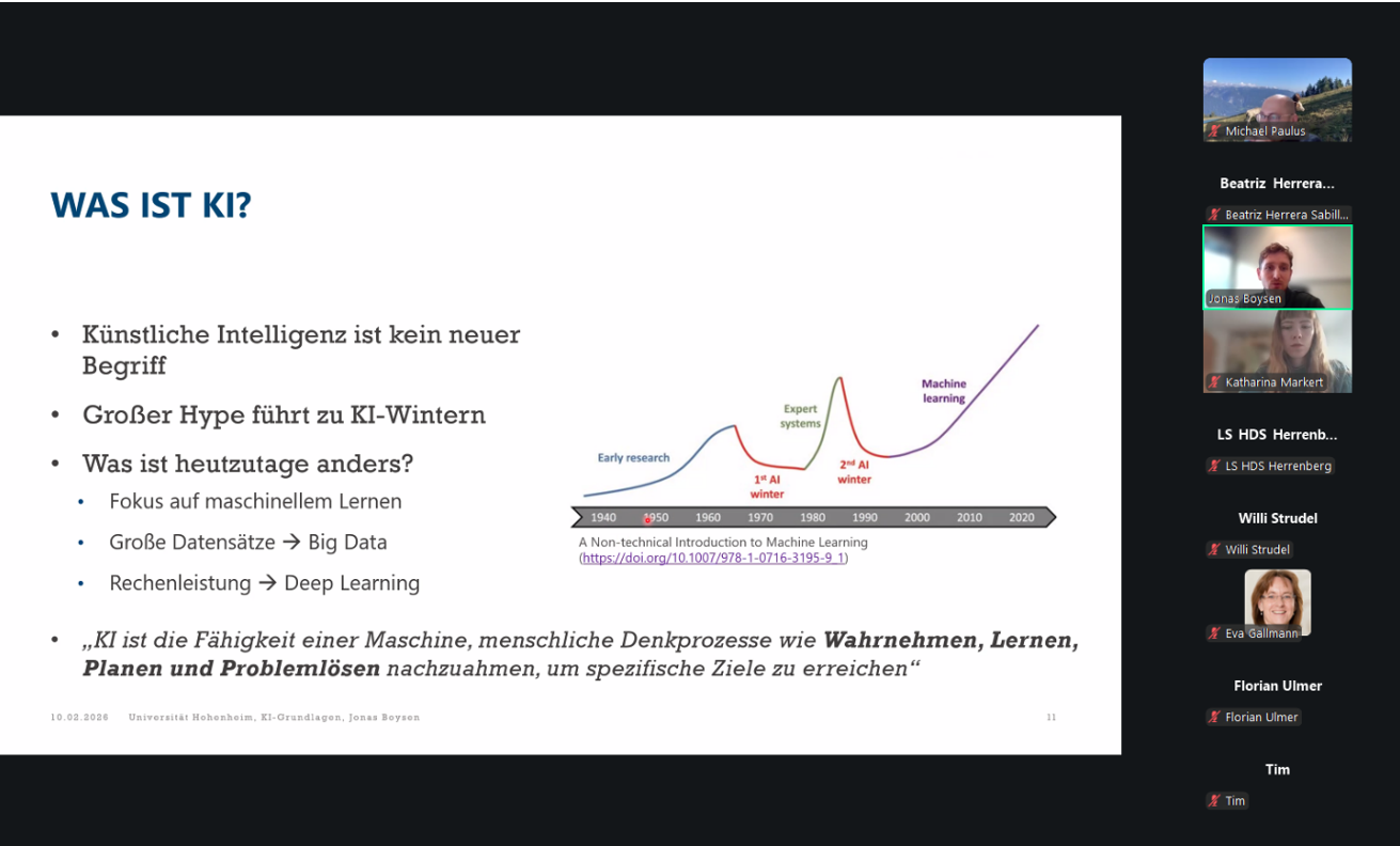 Fachliche Impulse lieferten mehrere Expertinnen: Jonas Boysen (Universität Hohenheim) erklärte die Grundlagen und Potenziale von KI in der Landwirtschaft. Prof. Dr. Eva Gallmann (Universität Hohenheim) zeigte praxisnah den Einsatz von Sensorik und KI in der Tierhaltung auf. Andreas Dörr berichtete aus seinem Pflanzenbaubetrieb in der bayerischen Rhön über die tägliche Nutzung von KI-Tools wie ChatGPT. Markus Pflugfelder (Versuchsstation Ihinger Hof) erläuterte, wie er KI-Anwendungen auf der Versuchsstation einsetzt und wie ihn diese im Arbeitsalltag bei Planungs- und Entscheidungsprozessen unterstützen. Zudem berichtete er, dass aktuell mit dem Hohenheimer Weizen Cup ein Anbauwettbewerb läuft, bei dem Schülerinnen und Studierende gegeneinander – und auch gegen eine KI – antreten.